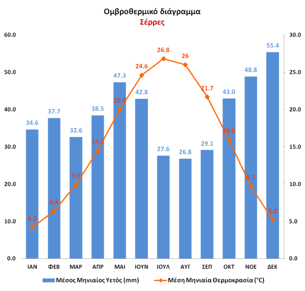 | Μέσο Μηνιαίο Ύψος Υετού | 34.6 | 37.7 | 32.6 | 38.5 | 47.3 | 42.8 | 27.6 | 26.8 | 29.1 | 43.0 | 48.8 | 55.4 |